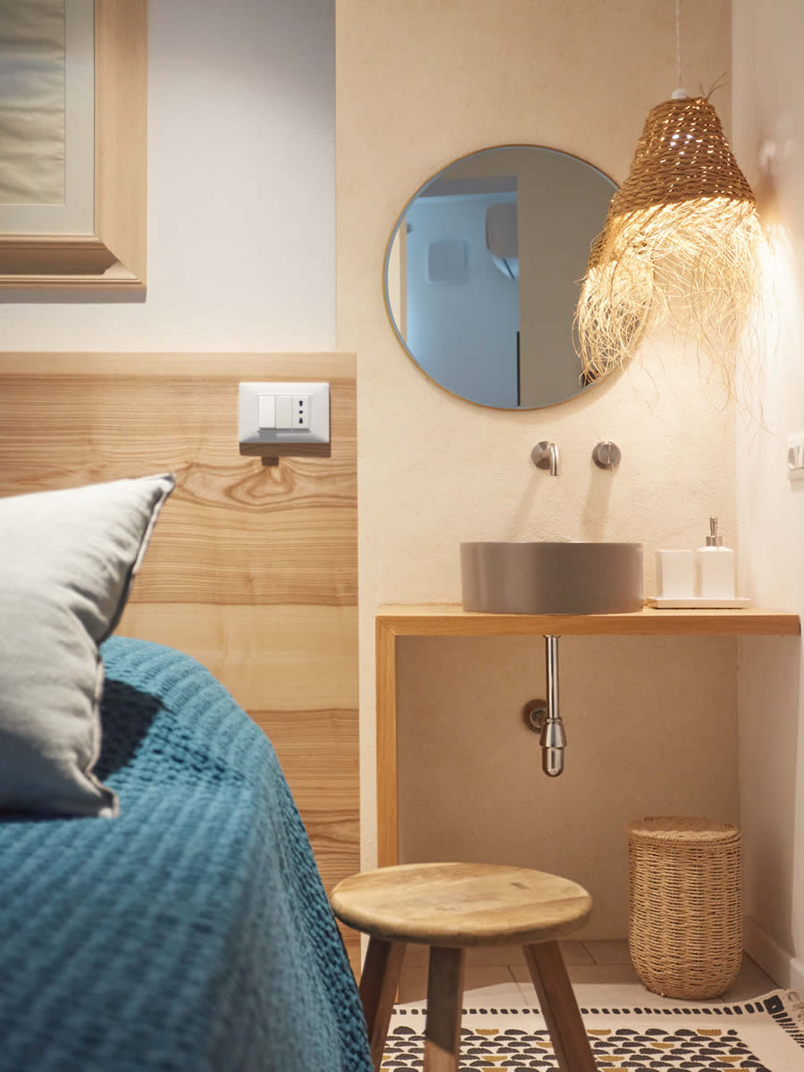 Questa camera si trova nella zona antistante la piscina ed è composta da un unico vano, con letto matrimoniale e ampio ed elegante bagno a vista ricavato dalla pietra.